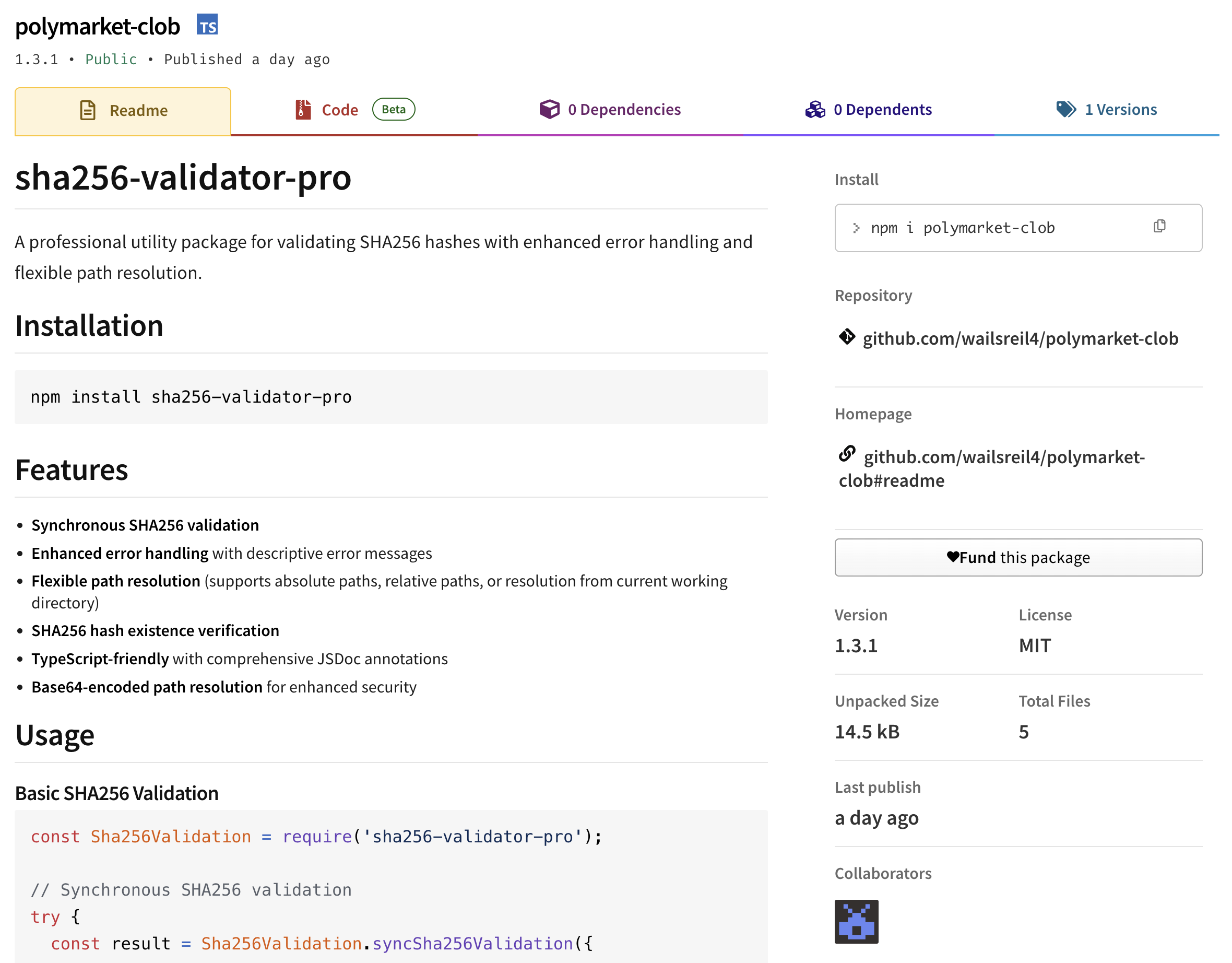 Our team has analyzed all the packages involved and while we can't say that the same threat actor published all of these packages, we can absolutely say that polymarket-clob was based on sha256-validator-pro which in turn was based on sha256-validateor-pack.