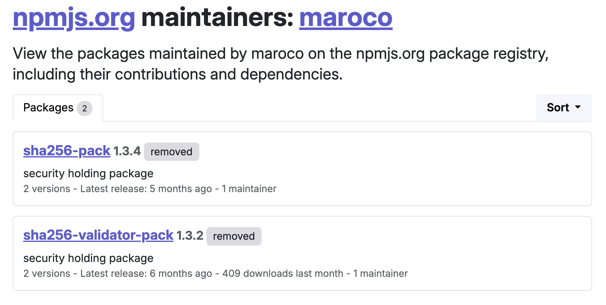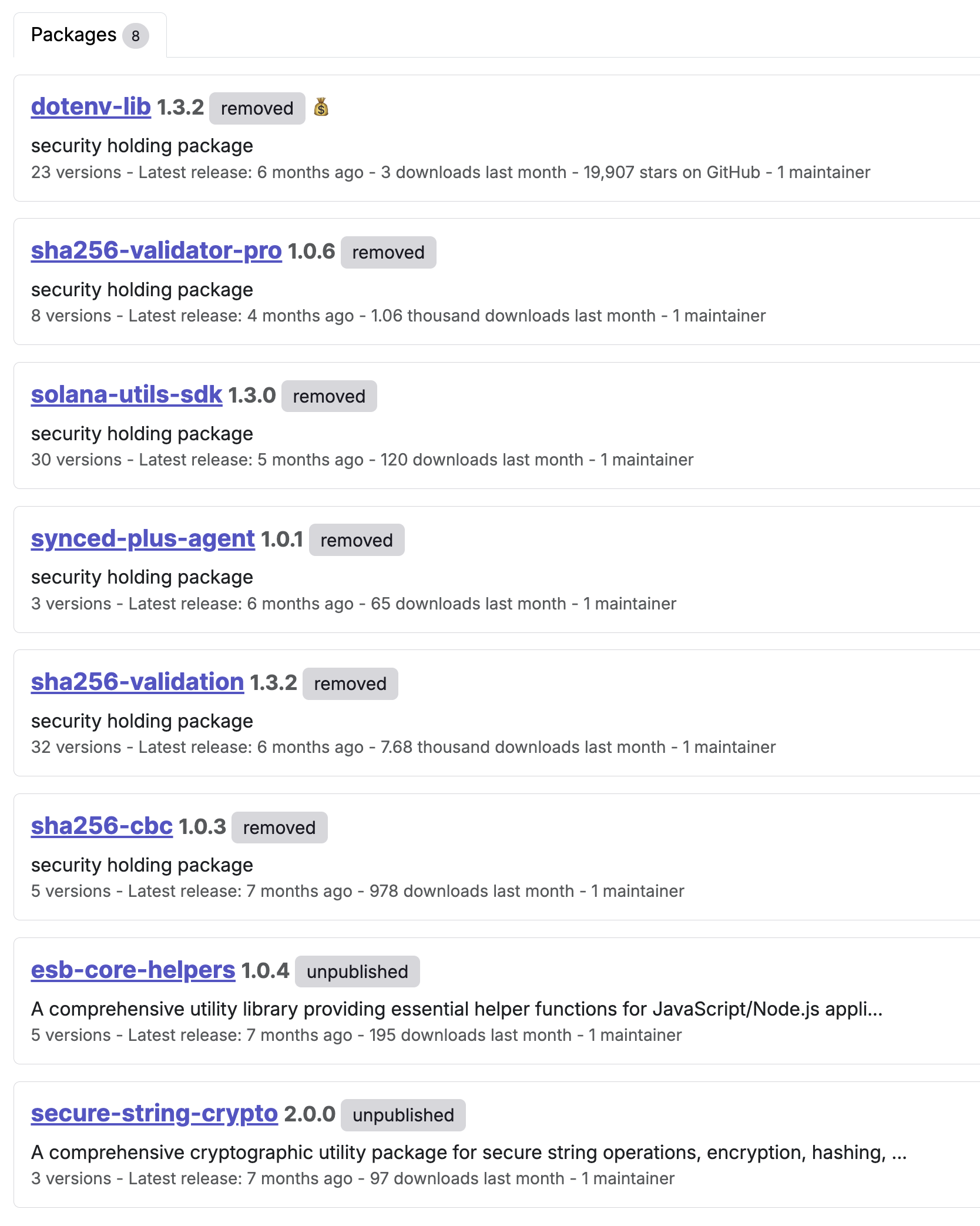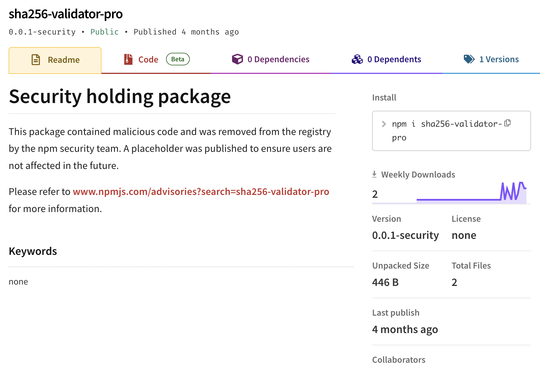 If we go and check out the sha256-validator-pro package we see that it was removed from the NPM registry back in August, 2025: