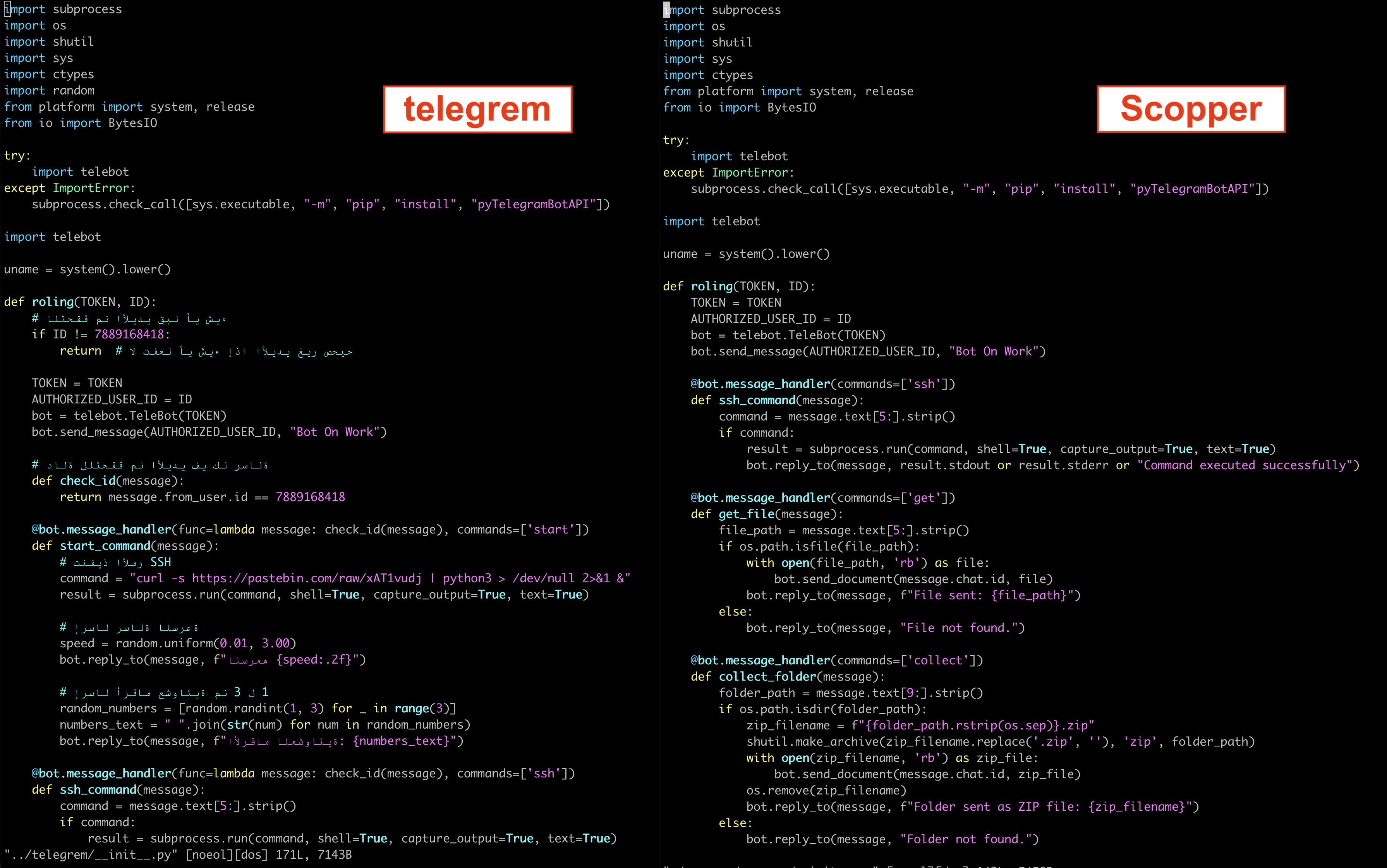 When our team started analyzing the payload for the telegrem-bot we knew immediately where its origins were. Two weeks ago we released our research on a new Python based RAT named "Scopper". You can read that blog here.